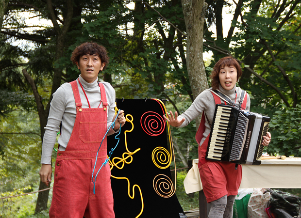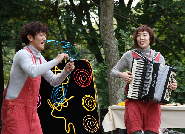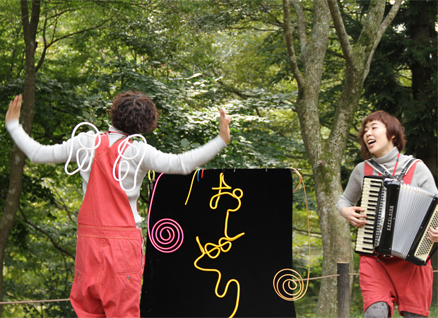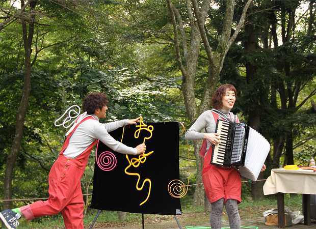 どなたでも参加できる簡単なワークショップです。おしどりのパフォーマンスつき!