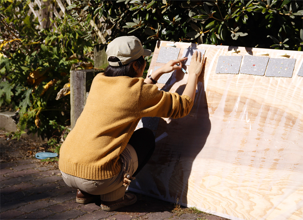 食品の紙容器を細かくちぎったパルプで手漉き葉書を作り、その中に六甲で採れたヒマワリの種子を埋め込んで、世界に発信するプロジェクト。