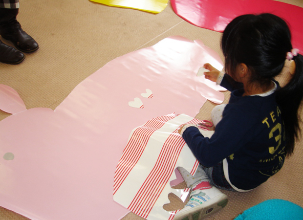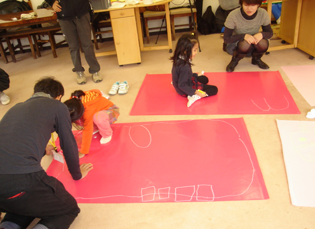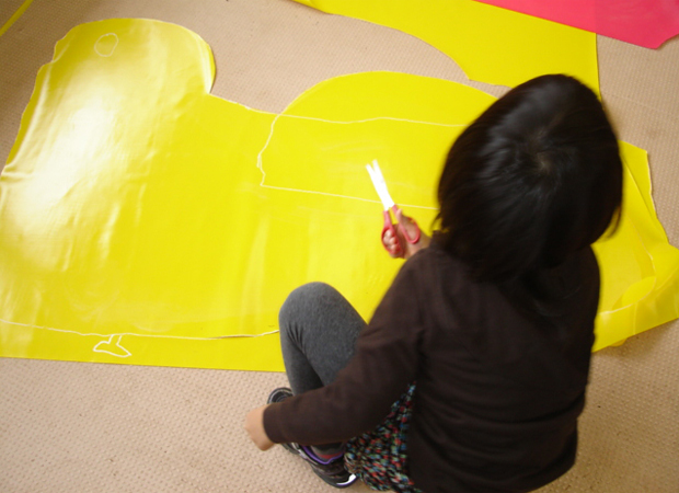 ワークショップで描いて頂いた動物の絵を拡大し、大きな動物のシルエットのシートを制作します。