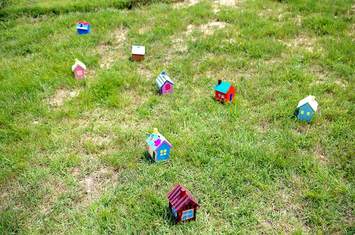 完成した作品を芝生の上に並べて撮影。自分のお家を建てるならどこがいいかな?考えながら場所を探しました。巨人になった気分。