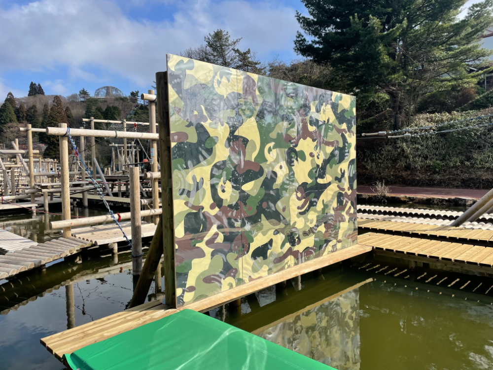 迷彩柄の横幅約4mに及ぶ壁に背を沿わせながら、段々と狭くなる足場を進んでいき、3秒以内でのクリアを目指すアスレチック