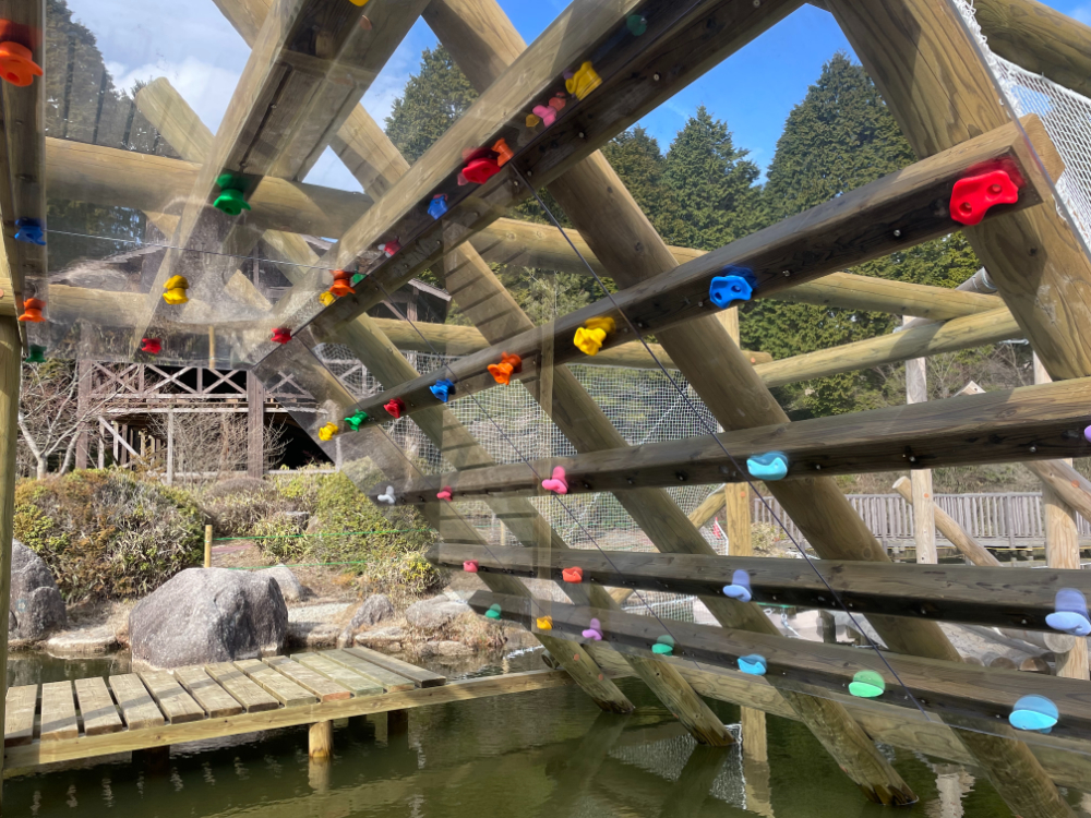 斜度約135~約180度に設置された、色鮮やかな足場を使ってゴールを目指すアスレチック