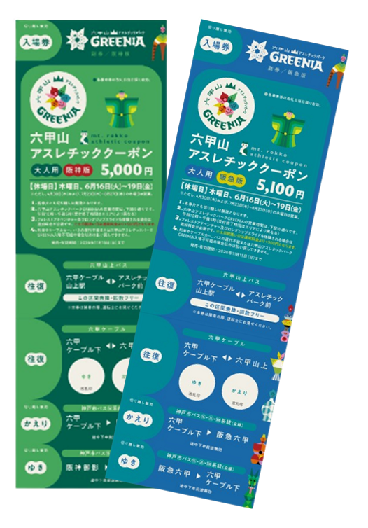 「六甲ケーブル」と「六甲山アスレチックパーク GREENIA」の入場券がセットになったクーポンです。