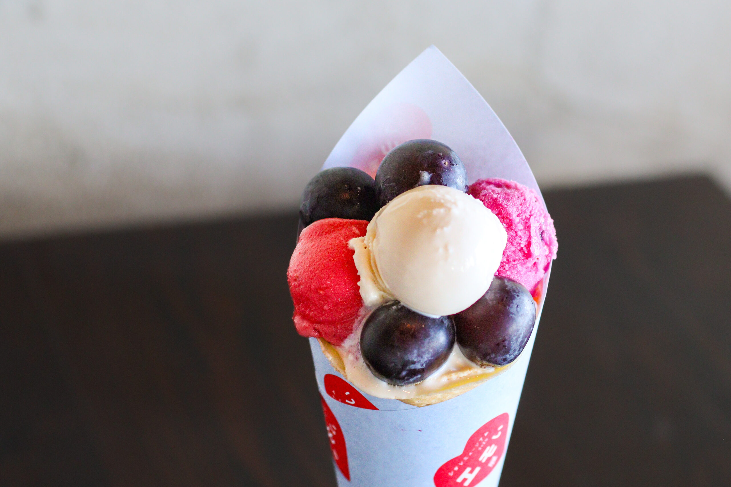 甘酸っぱい自家製ラズベリーソースを塗ったクレープに三種のアイスクリームとぶどうを贅沢に合わせました。 秋の装いを感じるクレープになっています。 ※ぶどうの皮は食べられますが、気になる方は皮をむいてお召し上がりください。 ※14時~販売